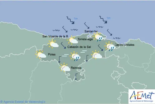 Temperaturas máximas y mínimas previstas: Cabezón de la Sal, 17 y 11 grados; San Vicente de la Barquera, 17 y 11; Santander, 17 y 12; Castro Urdiales, 17 y 11; Potes, 17 y 9; Reinosa, 12 y 5; y Torrelavega, 18 y 12 grados.