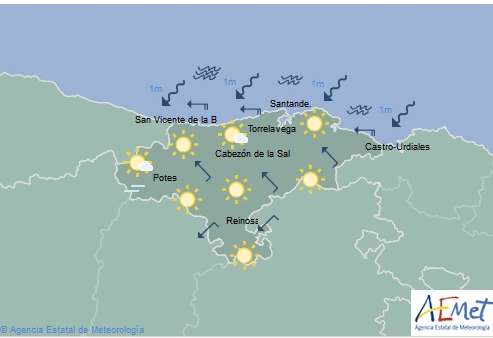 Temperaturas máximas y mínimas previstas: Cabezón de la Sal, 18 y 9 grados; San Vicente de la Barquera, 16 y 8; Santander, 17 y 10; Castro Urdiales, 16 y 7; Potes, 22 y 7; Reinosa, 18 y -1; y Torrelavega, 19 y 8 grados.
