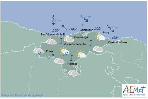 Temperaturas máximas y mínimas previstas: Cabezón de la Sal,20 y 9 grados; San Vicente de la Barquera, 18 y 10; Santander, 22 y 11; Castro Urdiales, 23 y 10; Potes, 23 y 9; Reinosa, 20 y 6; y Torrelavega, 23 y 11 grados.