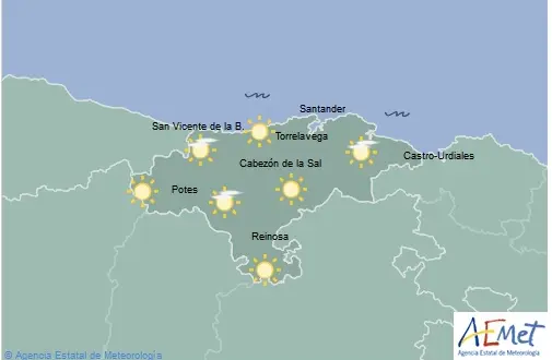 Temperaturas máximas y mínimas previstas: Cabezón de la Sal, 21 y 12 grados; San Vicente de la Barquera, 18 y 12; Santander, 19 y 13; Castro Urdiales, 19 y 13; Potes, 29 y 12; Reinosa, 27 y 7; y Torrelavega, 22 y 12 grados.