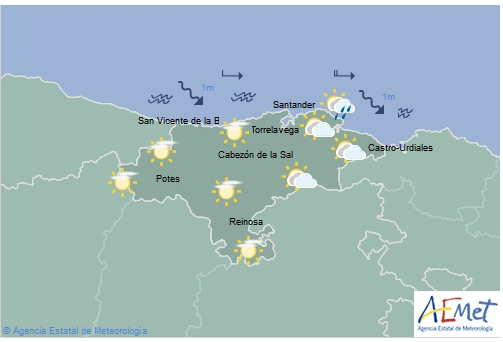 Temperaturas máximas y mínimas previstas: Cabezón de la Sal, 16 y 7 grados; San Vicente de la Barquera, 15 y 7; Santander, 16 y 10; Castro Urdiales, 16 y 11; Potes, 19 y 2; Reinosa, 15 y 0; y Torrelavega, 18 y 9 grados.