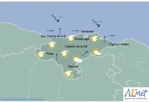Temperaturas máximas y mínimas previstas: Cabezón de la Sal, 19 y 9 grados; San Vicente de la Barquera, 17 y 10; Santander, 18 y 12; Castro Urdiales, 18 y 12; Potes, 21 y 7; Reinosa, 17 y 4; y Torrelavega, 19 y 11 grados.