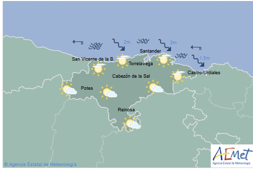 Temperaturas máximas y mínimas previstas: Cabezón de la Sal, 21 y 8 grados; San Vicente de la Barquera, 18 y 8; Santander, 18 y 10; Castro Urdiales, 17 y 10; Potes, 25 y 7; Reinosa, 21 y 5; y Torrelavega, 22 y 9 grados.