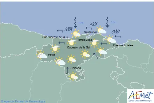Temperaturas máximas y mínimas previstas: Cabezón de la Sal, 19 y 6 grados; San Vicente de la Barquera, 17 y 6; Santander, 17 y 9; Castro Urdiales, 16 y 7; Potes, 24 y 6; Reinosa, 21 y 1; y Torrelavega, 20 y 7 grados.