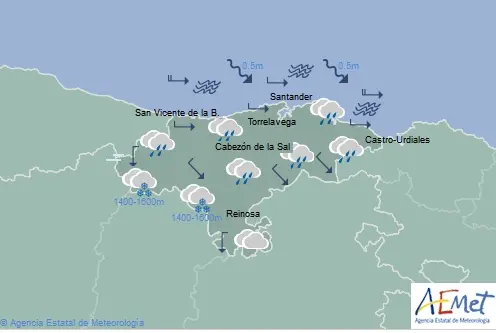 Temperaturas máximas y mínimas previstas: Cabezón de la Sal, 17 y 9 grados; San Vicente de la Barquera, 18 y 10; Santander, 18 y 11; Castro Urdiales, 17 y 10; Potes, 16 y 6; Reinosa, 13 y 3; y Torrelavega, 18 y 11 grados.
