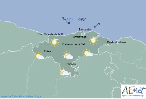 Temperaturas máximas y mínimas previstas: Cabezón de la Sal, 20 y 9 grados; San Vicente de la Barquera, 16 y 8; Santander, 17 y 9; Castro Urdiales, 17 y 9; Potes, 22 y 7; Reinosa, 18 y 4; y Torrelavega, 21 y 9 grados.
