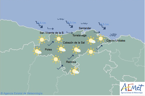 Temperaturas máximas y mínimas previstas: Cabezón de la Sal, 21 y 12 grados; San Vicente de la Barquera, 19 y 14; Santander, 20 y 14; Castro Urdiales, 19 y 12; Potes, 28 y 11; Reinosa, 26 y 9; y Torrelavega, 22 y 13 grados.