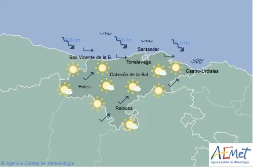 Temperaturas máximas y mínimas previstas: Cabezón de la Sal, 21 y 12 grados; San Vicente de la Barquera, 19 y 14; Santander, 20 y 14; Castro Urdiales, 19 y 12; Potes, 28 y 11; Reinosa, 26 y 9; y Torrelavega, 22 y 13 grados.