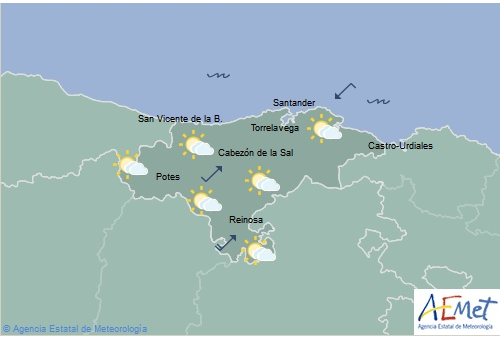 Temperaturas máximas y mínimas previstas: Cabezón de la Sal, 21 y 14 grados; San Vicente de la Barquera, 19 y 13; Santander, 21 y 16; Castro Urdiales, 20 y 16; Potes, 24 y 13; Reinosa, 22 y 8; y Torrelavega, 23 y 15 grados.