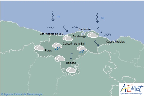 Temperaturas máximas y mínimas previstas: Cabezón de la Sal, 21 y 16 grados; San Vicente de la Barquera, 20 y 18; Santander, 21 y 17; Castro Urdiales, 20 y 17; Potes, 23 y 17; Reinosa, 20 y 12; y Torrelavega, 22 y 16 grados.