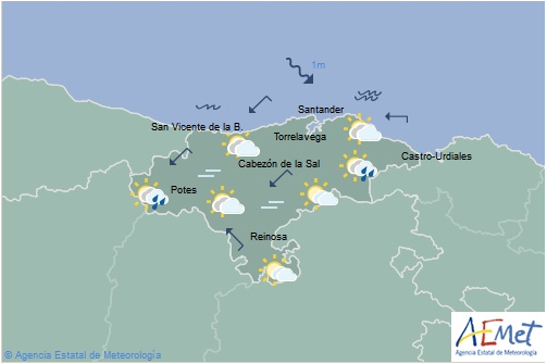 Temperaturas máximas y mínimas previstas: Cabezón de la Sal, 21 y 16 grados; San Vicente de la Barquera, 19 y 15; Santander, 21 y 16; Castro Urdiales, 20 y 17; Potes, 26 y 15; Reinosa, 27 y 10; y Torrelavega, 23 y 16 grados.