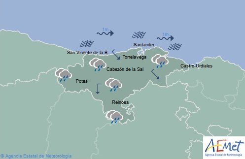 Temperaturas máximas y mínimas previstas: Cabezón de la Sal, 17 y 10 grados; San Vicente de la Barquera, 16 y 11; Santander, 17 y 13; Castro Urdiales, 16 y 12; Potes, 19 y 6; Reinosa, 13 y 4; y Torrelavega, 18 y 12 grados.