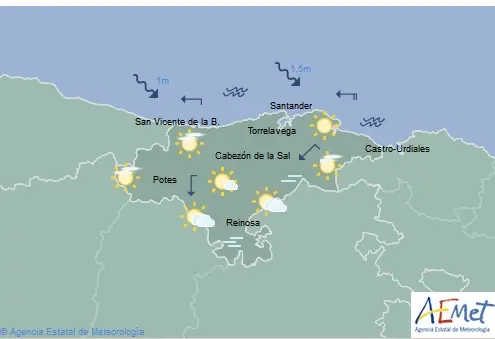Temperaturas máximas y mínimas previstas: Cabezón de la Sal, 19 y 7 grados; San Vicente de la Barquera, 16 y 8; Santander, 18 y 9; Castro Urdiales, 16 y 7; Potes, 22 y 8; Reinosa, 18 y 3; y Torrelavega, 21 y 7 grados.