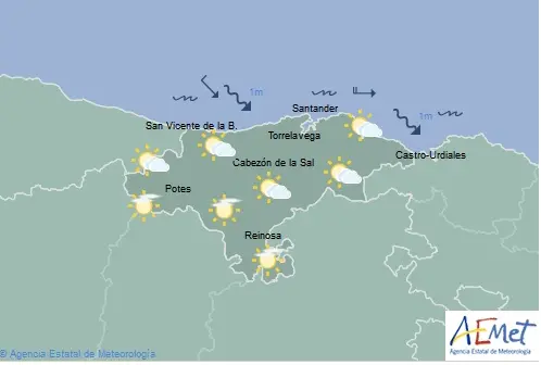 Temperaturas máximas y mínimas previstas: Cabezón de la Sal, 20 y 12 grados; San Vicente de la Barquera, 19 y 12; Santander, 20 y 14; Castro Urdiales, 20 y 14; Potes, 23 y 12; Reinosa, 22 y 5; y Torrelavega, 21 y 14 grados.