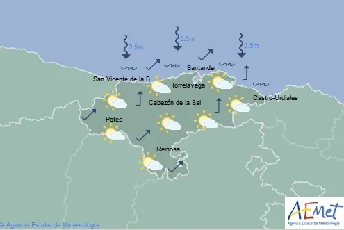Temperaturas máximas y mínimas previstas: Cabezón de la Sal, 19 y 9 grados; San Vicente de la Barquera, 18 y 10; Santander, 20 y 10; Castro Urdiales, 19 y 9; Potes, 24 y 8; Reinosa, 20 y 4; y Torrelavega, 20 y 8 grados.