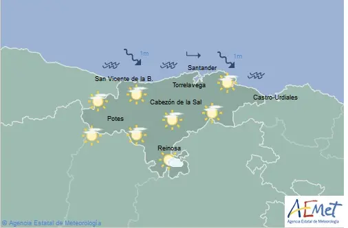 Temperaturas máximas y mínimas previstas: Cabezón de la Sal, 17 y 7 grados; San Vicente de la Barquera, 15 y 7; Santander, 17 y 6; Castro Urdiales, 17 y 8; Potes, 19 y 3; Reinosa, 15 y 0; y Torrelavega, 18 y 7 grados.