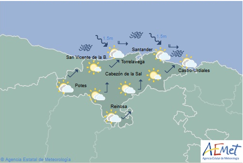 Temperaturas máximas y mínimas previstas: Cabezón de la Sal, 18 y 7 grados; San Vicente de la Barquera, 16 y 9; Santander, 17 y 11; Castro Urdiales, 17 y 10; Potes, 19 y 6; Reinosa, 13 y 3; y Torrelavega, 18 y 8 grados.