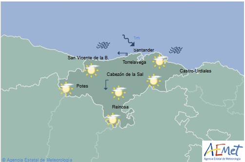 Temperaturas máximas y mínimas previstas: Cabezón de la Sal, 21 y 11 grados; San Vicente de la Barquera, 17 y 8; Santander, 18 y 11; Castro Urdiales, 17 y 11; Potes, 26 y 8; Reinosa, 23 y 5; y Torrelavega, 22 y 9 grados.