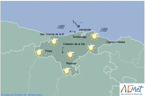 Temperaturas máximas y mínimas previstas: Cabezón de la Sal, 21 y 11 grados; San Vicente de la Barquera, 17 y 8; Santander, 18 y 11; Castro Urdiales, 17 y 11; Potes, 26 y 8; Reinosa, 23 y 5; y Torrelavega, 22 y 9 grados.