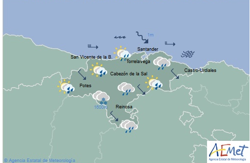 La Agencia Estatal de Meteorología (AEMET) prevé en Cantabria para este miércoles, día 5, cielo nuboso o cubierto disminuyendo a intervalos nubosos por la tarde, con lluvias y chubascos generalizados, ocasionalmente con tormentas, remitiendo desde el mediodía en el litoral y, al final, en toda la comunidad. No se descartan brumas o bancos de niebla.