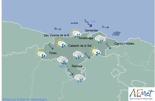 La Agencia Estatal de Meteorología (AEMET) prevé en Cantabria para este miércoles, día 5, cielo nuboso o cubierto disminuyendo a intervalos nubosos por la tarde, con lluvias y chubascos generalizados, ocasionalmente con tormentas, remitiendo desde el mediodía en el litoral y, al final, en toda la comunidad. No se descartan brumas o bancos de niebla.