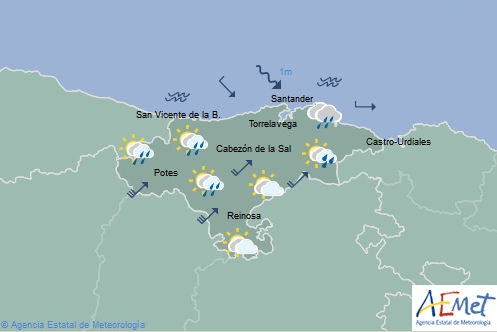 Temperaturas máximas y mínimas previstas: Cabezón de la Sal, 19 y 9 grados; San Vicente de la Barquera, 18 y 9; Santander, 20 y 12; Castro Urdiales, 20 y 11; Potes, 21 y 7; Reinosa, 18 y 5; y Torrelavega, 19 y 9 grados.