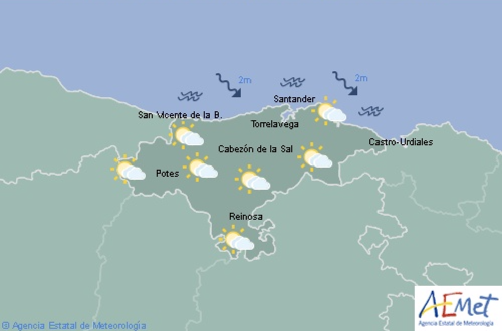 La Agencia Estatal de Meteorología prevé en Cantabria para mañana, día 7, intervalos nubosos, tendiendo a poco nuboso por la tarde. No se descartan brumas y bancos de niebla matinales y al últimas horas del día. Temperaturas mínimas en descenso y máximas en ascenso, excepto en el litoral donde permanecerán con pocos cambios. Viento flojo variable. Temperaturas máximas y mínimas previstas: Cabezón de la Sal, 21 y 12 grados; San Vicente de la Barquera, 20 y 14; Santander, 21 y 15; Castro Urdiales, 21 y 15; Potes, 24 y 10; Reinosa, 20 y 6, y Torrelavega, 22 y 13 grados.