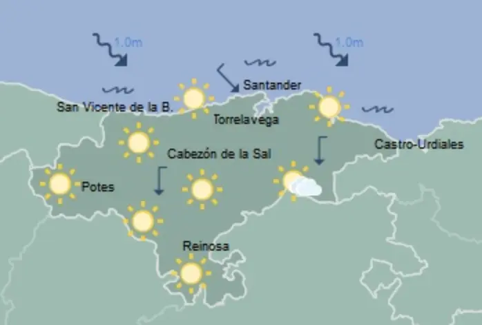 Temperaturas máximas y mínimas previstas: Cabezón de la Sal, 17 y 9 grados; San Vicente de la Barquera, 17 y 10; Santander, 17 y 12; Castro Urdiales, 16 y 8; Potes, 18 y 6; Reinosa, 13 y 4; y Torrelavega, 19 y 11 grados.