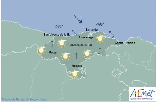 Temperaturas máximas y mínimas previstas: Cabezón de la Sal, 20 y 7 grados; San Vicente de la Barquera, 16 y 4; Santander, 19 y 8; Castro Urdiales, 18 y 7; Potes, 20 y 0; Reinosa, 14 y -2; y Torrelavega, 22 y 9 grados.