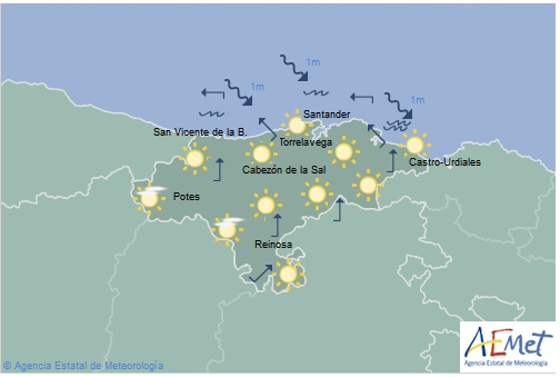 Temperaturas máximas y mínimas previstas: Cabezón de la Sal, 24 y 15 grados; San Vicente de la Barquera, 21 y 14; Santander, 21 y 15; Castro Urdiales, 25 y 15; Potes, 32 y 14; Reinosa, 28 y 11; y Torrelavega, 26 y 16 grados.