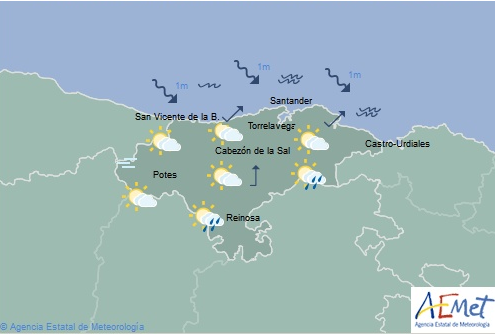 Temperaturas máximas y mínimas previstas: Cabezón de la Sal, 18 y 10 grados; San Vicente de la Barquera, 17 y 10; Santander, 19 y 12; Castro Urdiales, 18 y 10; Potes, 20 y 9; Reinosa, 17 y 4; y Torrelavega, 20 y 11 grados.