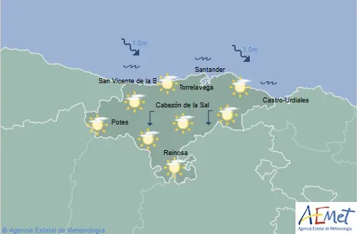 Temperaturas máximas y mínimas previstas: Cabezón de la Sal, 18 y 10 grados; San Vicente de la Barquera, 17 y 11; Santander, 17 y 10; Castro Urdiales, 16 y 11; Potes, 22 y 10; Reinosa, 17 y 6; y Torrelavega, 20 y 11 grados.