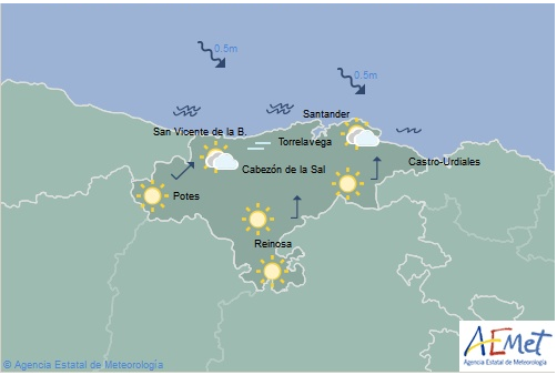 Temperaturas máximas y mínimas previstas: Cabezón de la Sal, 22 y 15 grados; San Vicente de la Barquera, 20 y 14; Santander, 21 y 15; Castro Urdiales, 21 y 16; Potes, 33 y 20; Reinosa, 34 y 15; y Torrelavega, 22 y 15 grados.