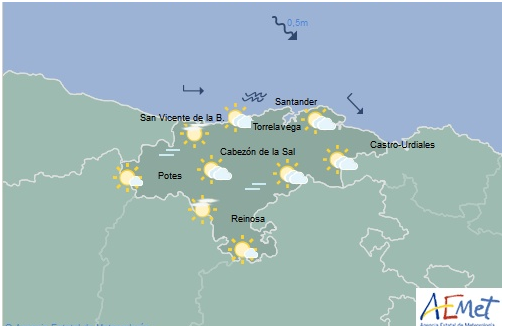 Temperaturas máximas y mínimas previstas: Cabezón de la Sal, 23 y 18 grados; San Vicente de la Barquera, 22 y 18; Santander, 23 y 19; Castro Urdiales, 22 y 18; Potes, 27 y 15; Reinosa, 27 y 11; y Torrelavega, 25 y 18 grados.