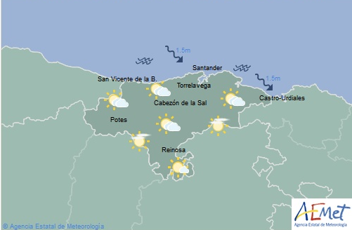 Temperaturas máximas y mínimas previstas: Cabezón de la Sal, 19 y 12 grados; San Vicente de la Barquera, 17 y 11; Santander, 18 y 12; Castro Urdiales, 18 y 13; Potes, 20 y 9; Reinosa, 18 y 6; y Torrelavega, 20 y 12 grados.