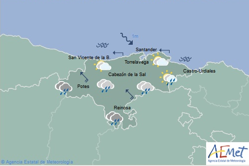 Temperaturas máximas y mínimas previstas: Cabezón de la Sal, 20 y 13 grados; San Vicente de la Barquera, 19 y 13; Santander, 18 y 11; Castro Urdiales, 17 y 13; Potes, 21 y 13; Reinosa, 16 y 8; y Torrelavega, 21 y 12 grados.