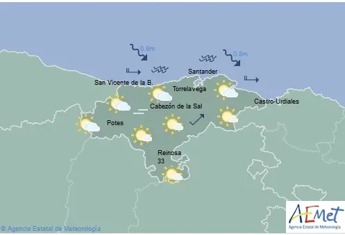 Temperaturas máximas y mínimas previstas: Cabezón de la Sal, 21 y 16 grados; San Vicente de la Barquera, 20 y 16; Santander, 21 y 16; Castro Urdiales, 21 y 16; Potes, 31 y 17; Reinosa, 33 y 16; y Torrelavega, 22 y 16 grados.