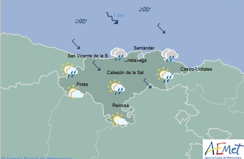 Temperaturas máximas y mínimas previstas: Cabezón de la Sal, 14 y 7 grados; San Vicente de la Barquera, 14 y 8; Santander, 15 y 9; Castro Urdiales, 14 y 10; Potes, 16 y 5; Reinosa, 10 y 1; y Torrelavega, 15 y 7 grados.
