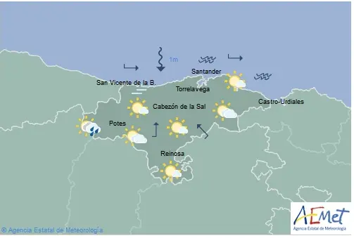 Temperaturas máximas y mínimas previstas: Cabezón de la Sal, 24 y 17 grados; San Vicente de la Barquera, 22 y 17; Santander, 23 y 18; Castro Urdiales, 28 y 18; Potes, 31 y 16; Reinosa, 30 y 14; y Torrelavega, 25 y 18 grados.