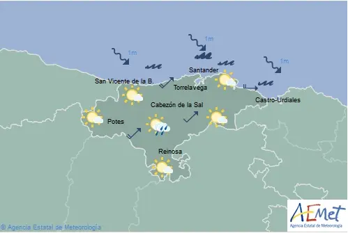 Temperaturas máximas y mínimas previstas: Cabezón de la Sal, 19 y 11 grados; San Vicente de la Barquera, 18 y 10; Santander, 18 y 13; Castro Urdiales, 19 y 13; Potes, 21 y 8; Reinosa, 16 y 5; y Torrelavega, 20 y 12 grados.