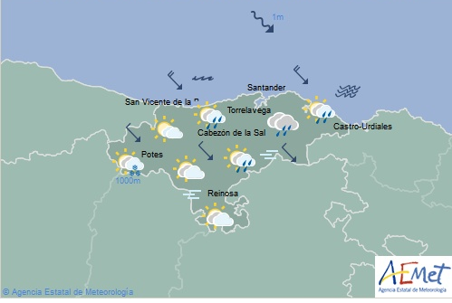 Temperaturas máximas y mínimas previstas: Cabezón de la Sal, 13 y 8 grados; San Vicente de la Barquera, 13 y 9; Santander, 14 y 11; Castro Urdiales, 13 y 8; Potes, 15 y 1; Reinosa, 9 y -2; y Torrelavega, 14 y 11 grados.