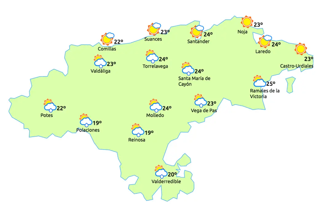 Temperaturas máximas y mínimas previstas: Cabezón de la Sal, 24 y 17 grados; San Vicente de la Barquera, 24 y 17; Santander, 24 y 18; Castro Urdiales, 24 y 18; Potes, 25 y 15; Reinosa, 22 y 10; y Torrelavega, 25 y 17 grados.