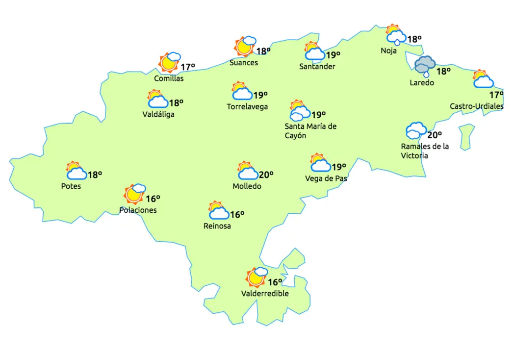 Temperaturas máximas y mínimas previstas: Cabezón de la Sal, 20 y 15 grados; San Vicente de la Barquera, 19 y 15; Santander, 19 y 16; Castro Urdiales, 19 y 15; Potes, 23 y 12; Reinosa, 18 y 7; y Torrelavega, 20 y 14 grados.