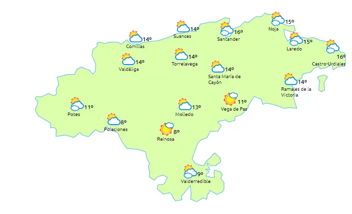 Temperaturas máximas y mínimas previstas: Cabezón de la Sal, 15 y 11 grados; San Vicente de la Barquera, 15 y 9; Santander, 16 y 10; Castro Urdiales, 16 y 4; Potes, 13 y 3; Reinosa, 10 y 3; y Torrelavega, 16 y 10 grados.