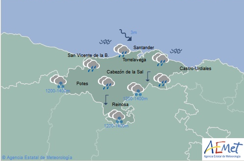 Temperaturas máximas y mínimas previstas: Cabezón de la Sal, 12 y 8 grados; San Vicente de la Barquera, 13 y 9; Santander, 13 y 10; Castro Urdiales, 13 y 9; Potes, 9 y 1; Reinosa, 7 y 0; y Torrelavega, 13 y 9 grados.