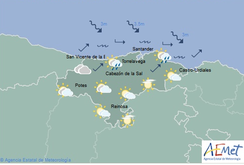 Temperaturas máximas y mínimas previstas: Cabezón de la Sal, 12 y 6 grados; San Vicente de la Barquera, 12 y 7; Santander, 14 y 6; Castro Urdiales, 15 y 8; Potes, 11 y 2; Reinosa, 7 y -3; y Torrelavega, 12 y 5 grados.