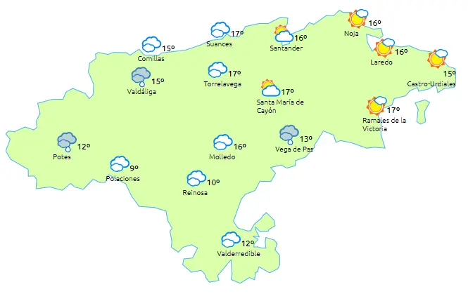 Temperaturas máximas y mínimas previstas: Cabezón de la Sal, 17 y 13 grados; San Vicente de la Barquera, 16 y 12; Santander, 18 y 9; Castro Urdiales, 17 y 14; Potes, 16 y 3; Reinosa, 11 y 7; y Torrelavega, 18 y 13 grados.