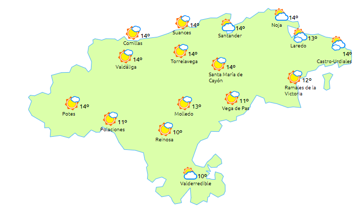 Temperaturas máximas y mínimas previstas: Cabezón de la Sal, 14 y 6 grados; San Vicente de la Barquera, 14 y 7; Santander, 15 y 9; Castro Urdiales, 15 y 9; Potes, 16 y 3; Reinosa, 12 y 0; y Torrelavega, 15 y 8 grados.
