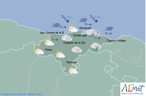 Temperaturas máximas y mínimas previstas: Cabezón de la Sal, 12 y 6 grados; San Vicente de la Barquera, 12 y 6; Santander, 12 y 7; Castro Urdiales, 12 y 7; Potes, 11 y 0; Reinosa, 6 y -3; y Torrelavega, 13 y 6 grados.