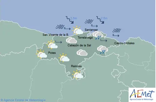 Temperaturas máximas y mínimas previstas: Cabezón de la Sal, 12 y 6 grados; San Vicente de la Barquera, 12 y 6; Santander, 12 y 7; Castro Urdiales, 12 y 7; Potes, 11 y 0; Reinosa, 6 y -3; y Torrelavega, 13 y 6 grados.